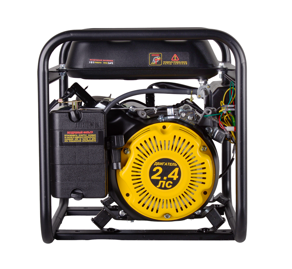 Генератор функционирует благодаря четырёхтактному двигателю мощностью 2,4 л.с., запускается вручную.